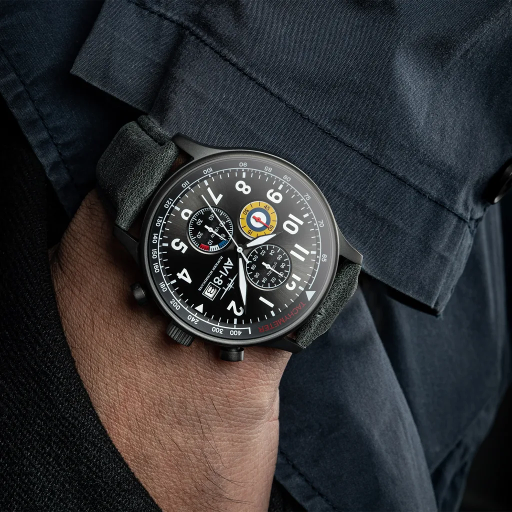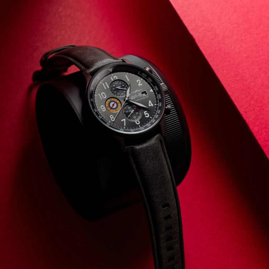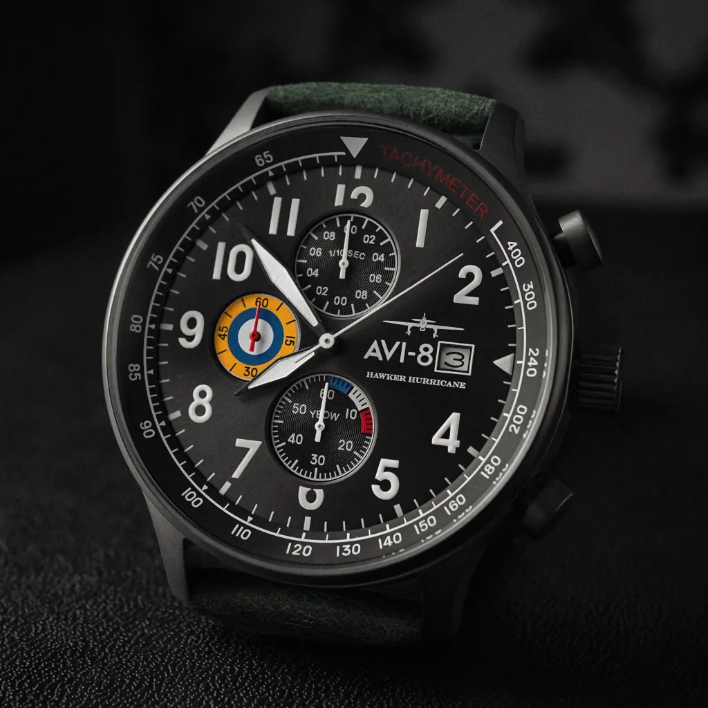 A tribute to what is maybe the most famous plane from World War II. The simplicity of the Hawker Hurricane Classic Chronograph’s design reminds one of that of its namesake. The dial is surrounded by strong, clean lines, and the colors and graphics highlight the fighter plane’s iconic, eye-catching design that helped identify the Hawker Hurricane.